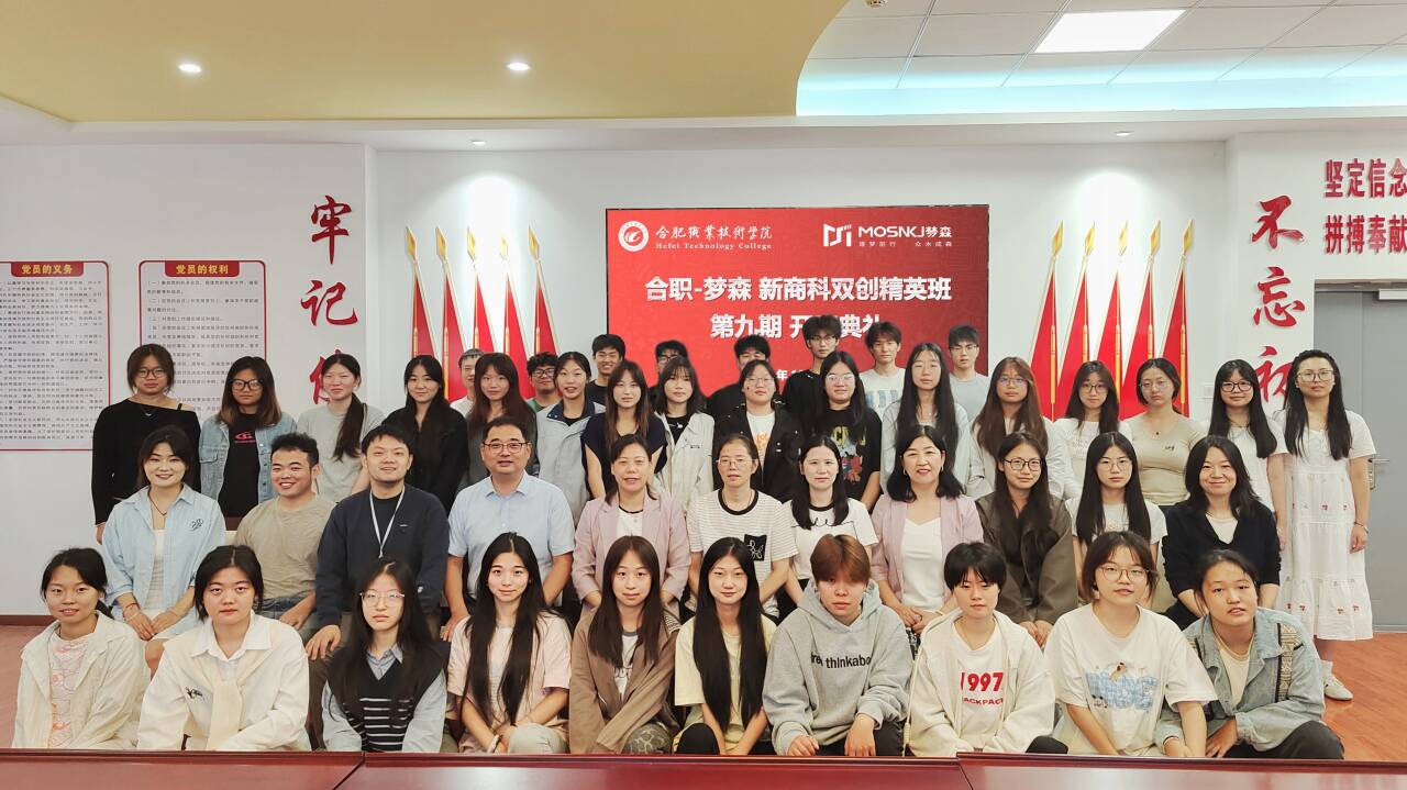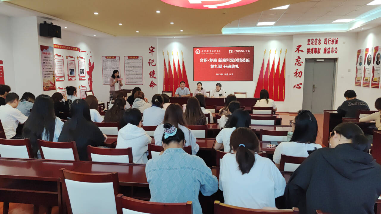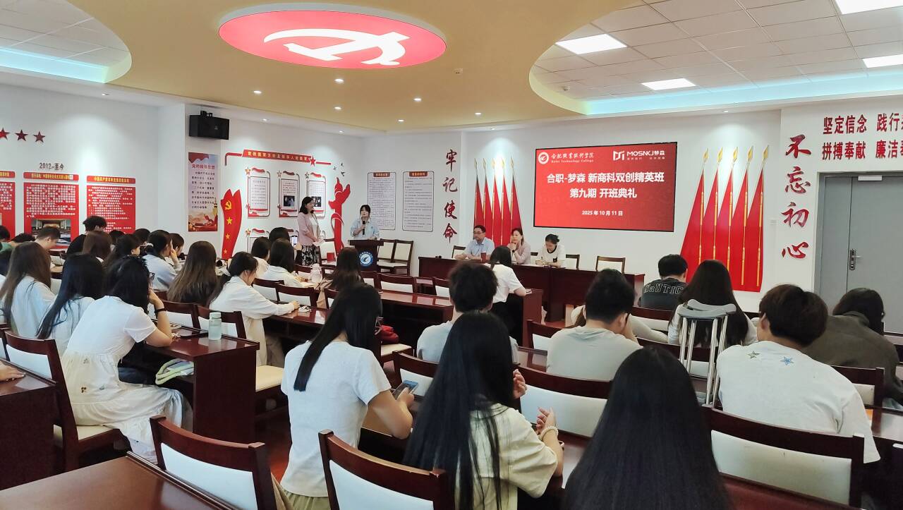 10月11日上午,伟德体育官方网站第九期“合职-梦森”新商科双创精英班(简称“双创班”)开班仪式在经贸楼党性体验馆隆重举行。伟德体育官方网站经理赵红、电子商务教研室主任王传芸、辅导员董如恺、袁佳庆,安徽梦森科技有限公司总经理吴捷、企业项目导师乔安,以及2024级电子商务专业37名新学员共同参加仪式。本次活动标志着新一期双创班正式启航,进一步推动校企协同育人机制落地,持续赋能新商科实战人才培养。