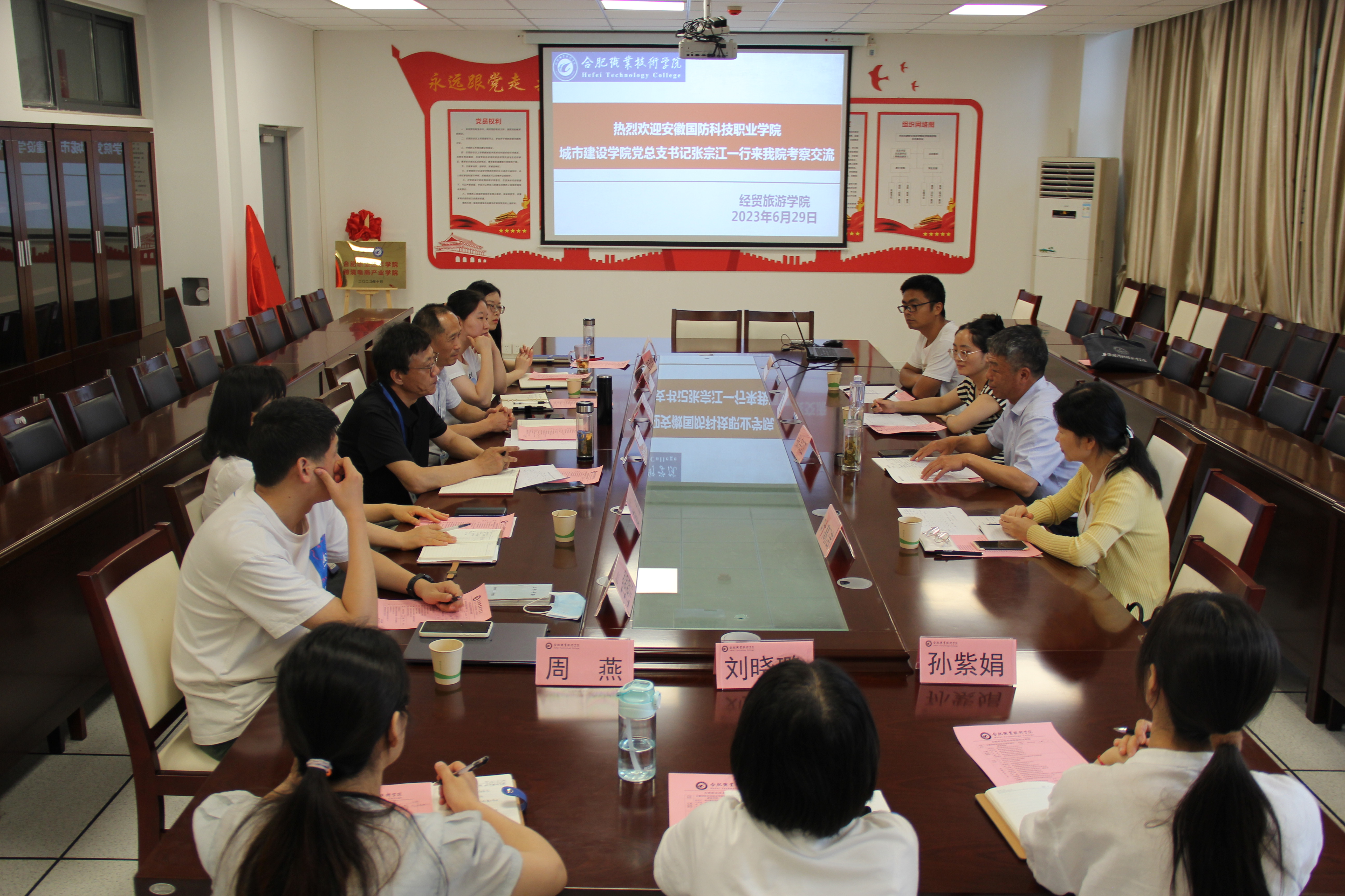 6月29日,安徽国防科技职业公司城市建设公司党总支书记张宗江一行来到伟德体育官方网站调研党建工作、员工管理工作、团学工作和会计类专业毕业生就业工作。经贸旅游公司党总支书记梅亚松、经理赵红、党总支副书记刘圣春及学管办全体工作人员参加本次会议。