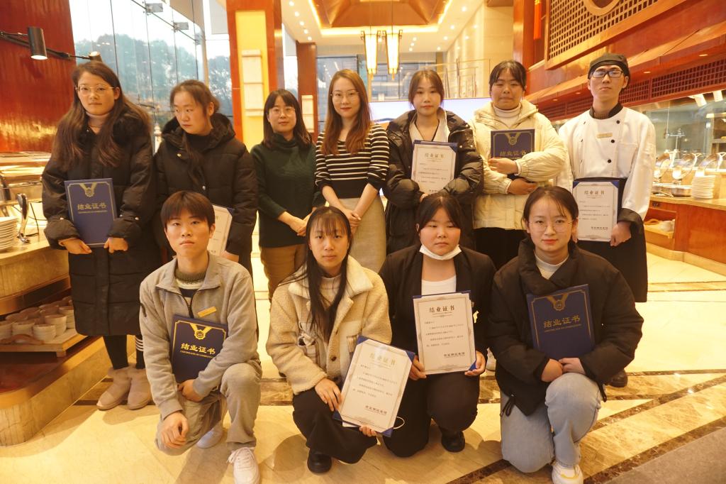 最后,酒店为每位实习生颁发了结业证书,张晓青总经理对同学们的工作给予了充分的肯定,并分析了酒店行业的发展前景,建议同学们能对自己的未来有一个好的职业生涯规划,希望有意愿的同学能够继续留在酒店行业发展。她祝愿同学们的实习生活丰富多彩富有意义,可以带着满满的收获结束实习。
