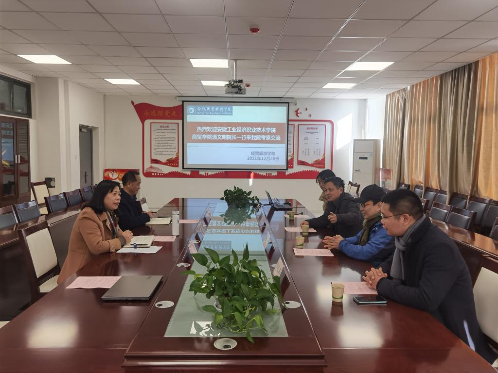12月28日,安徽工业经济职业技术公司商贸公司经理潘文明、国贸与跨境电商教研室主任朱颖、电子商务教研室主任武迪、地质与建筑工程公司(珠宝公司)地矿教研室主任李孔亮一行4人来公司考察交流。伟德体育官方网站经理赵红、副经理刘圣春,合职-梦森双创基地负责人、安徽梦森科技有限公司总经理吴捷在经贸楼会议室接待了来访客人。交流会由赵红主持。