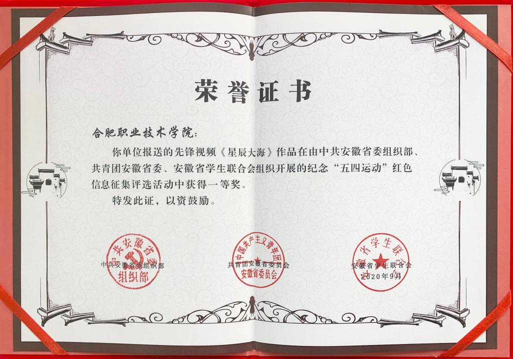 近日,由伟德体育官方网站团总支剪辑制作、校团委选送的先锋视频作品《星辰大海》在安徽省组织的纪念“五四运动”红色信息征集活动中荣获一等奖。