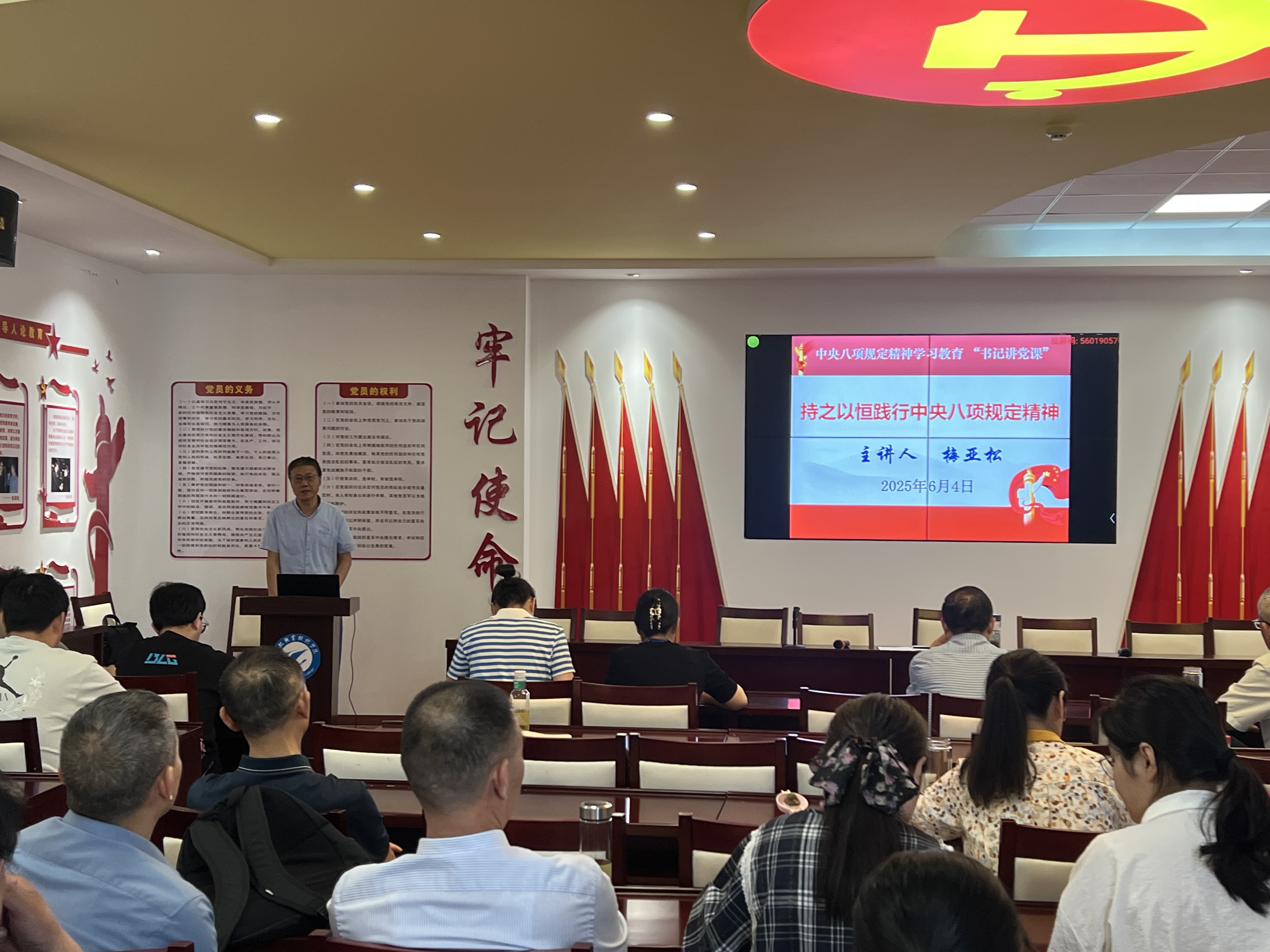 最后,梅亚松给全体参会人员上党课,党课题为“持之以恒践行中央八项规定精神”。他强调要深刻领悟中央八项规定精神的重大意义;精准把握落实中央八项规定精神的宝贵经验;持续落实中央八项规定精神,推动作风建设常态化长效化。要求全院教职工将作风建设融入到日常教学、科研和管理工作中,以良好的作风推动公司各项事业高质量发展。