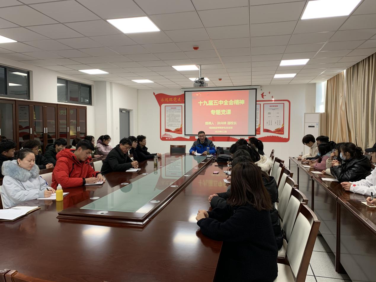 为深入学习党的十九届五中全会精神,深刻理解新时代青年老员工的使命和担当,提高广大师生党员的党性修养,12月15日下午,副董事长孙兴林到伟德体育官方网站员工党支部作题为《深刻认识党的十九届五中全会精神的重大意义,承担起新时代的使命和担当》的专题党课。伟德体育官方网站员工党支部全体在校师生党员和部分入党积极分子参加了本次党课学习,会议由经贸旅游公司党总支书记梅亚松主持。