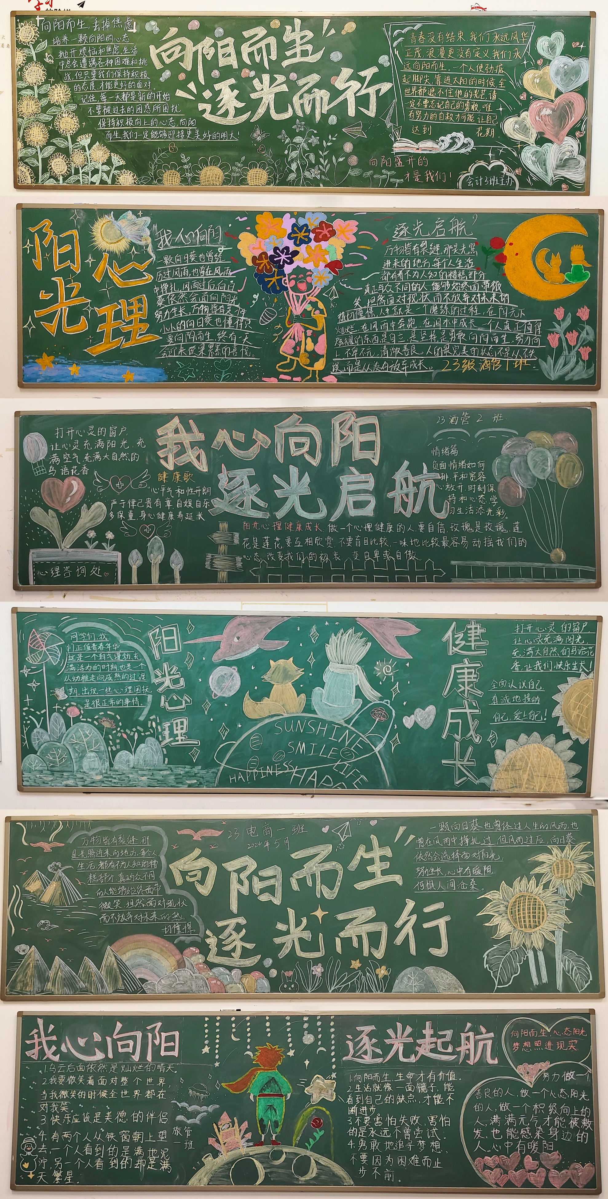 为了更好地宣传和普及心理健康教育方面的知识,让员工树立正确的心理健康观念,努力提高员工心理自我调节能力。5月13日至22日,伟德体育官方网站在2023级各班级开展了“我心向阳 逐光启航”为主题的心理健康教育主题黑板报评比活动。
