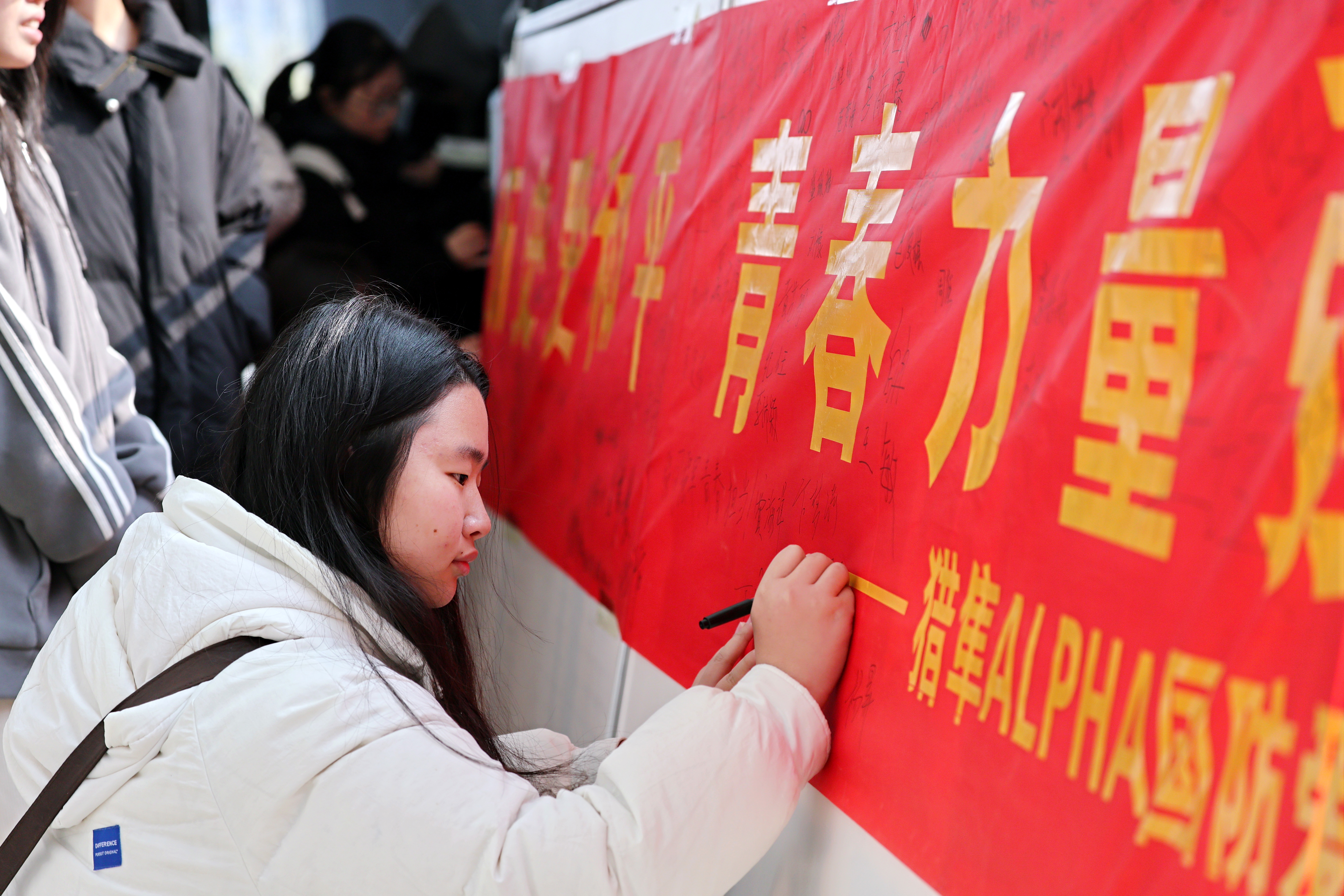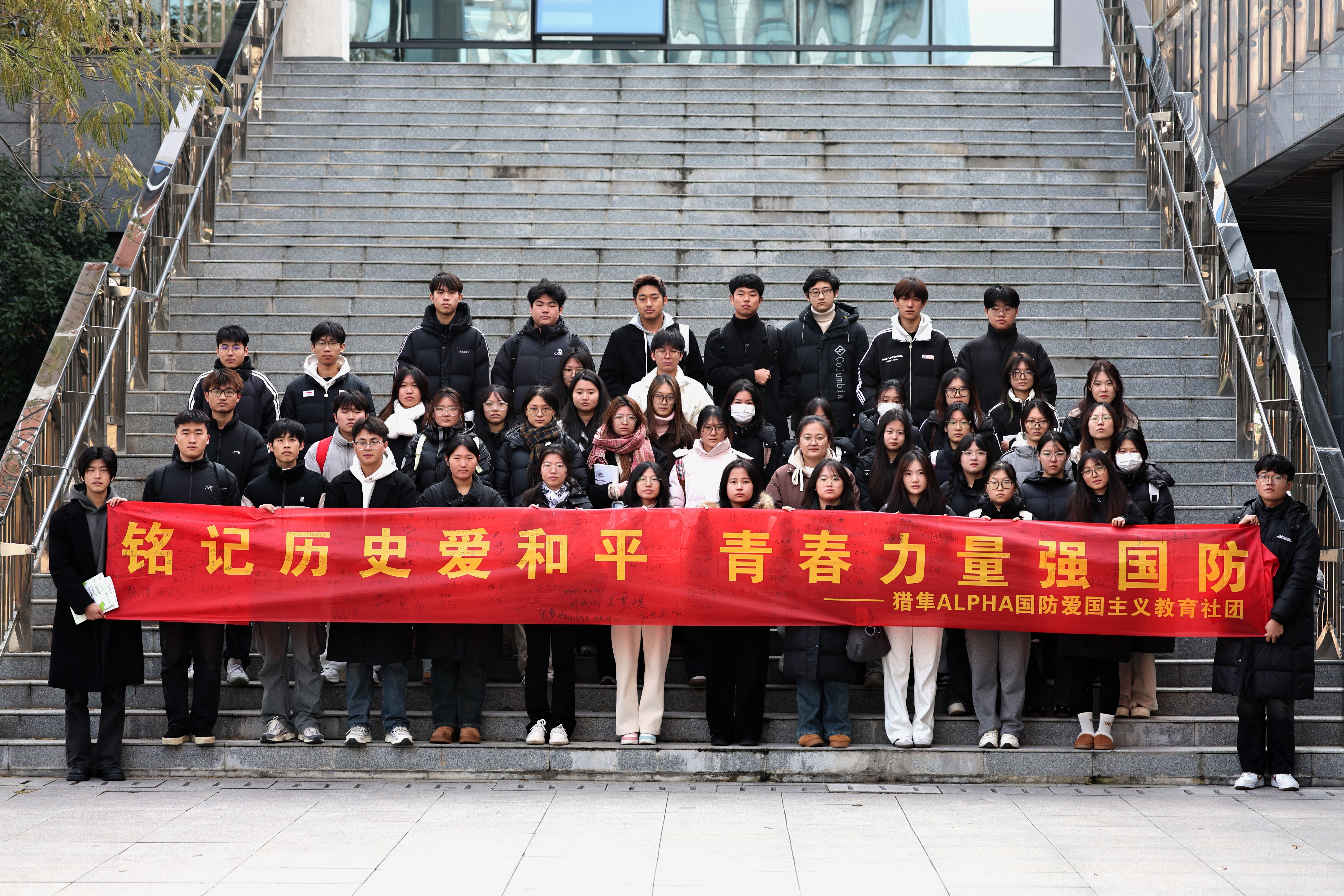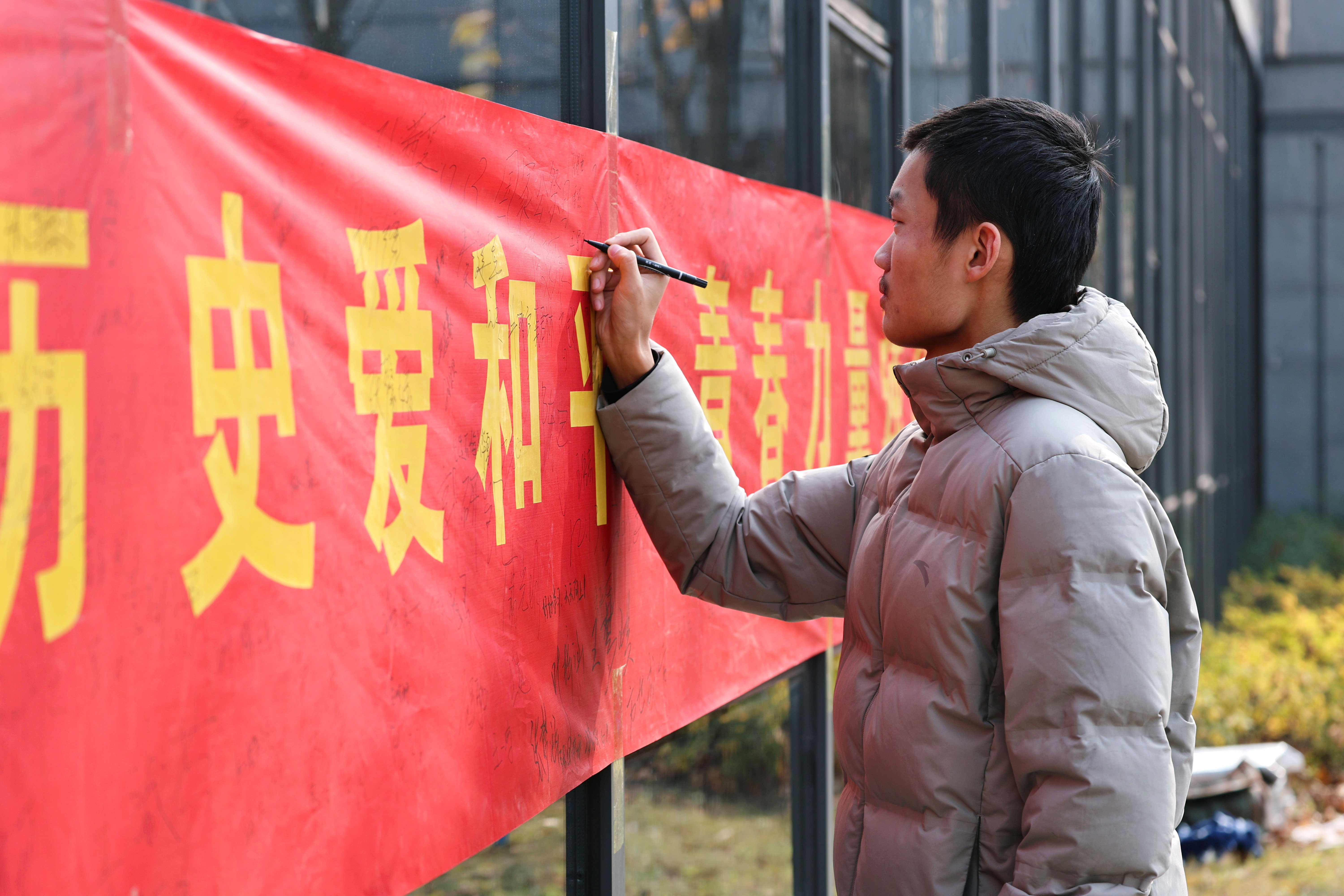 强国强军,青春担当。南京大屠杀的悲剧昭示我们,落后就要挨打,只有强国强军,才能安国兴邦。利用上午和中午的课余时间,社团在教学南楼一楼大厅和老员工活动中心广场举行了横幅签字活动,师生们在纪念横幅上写下自己的名字和留言,立志让青春身影奋力奔跑在强国发展需要的每一领域,让青春力量绽放在保卫祖国的热血军营!