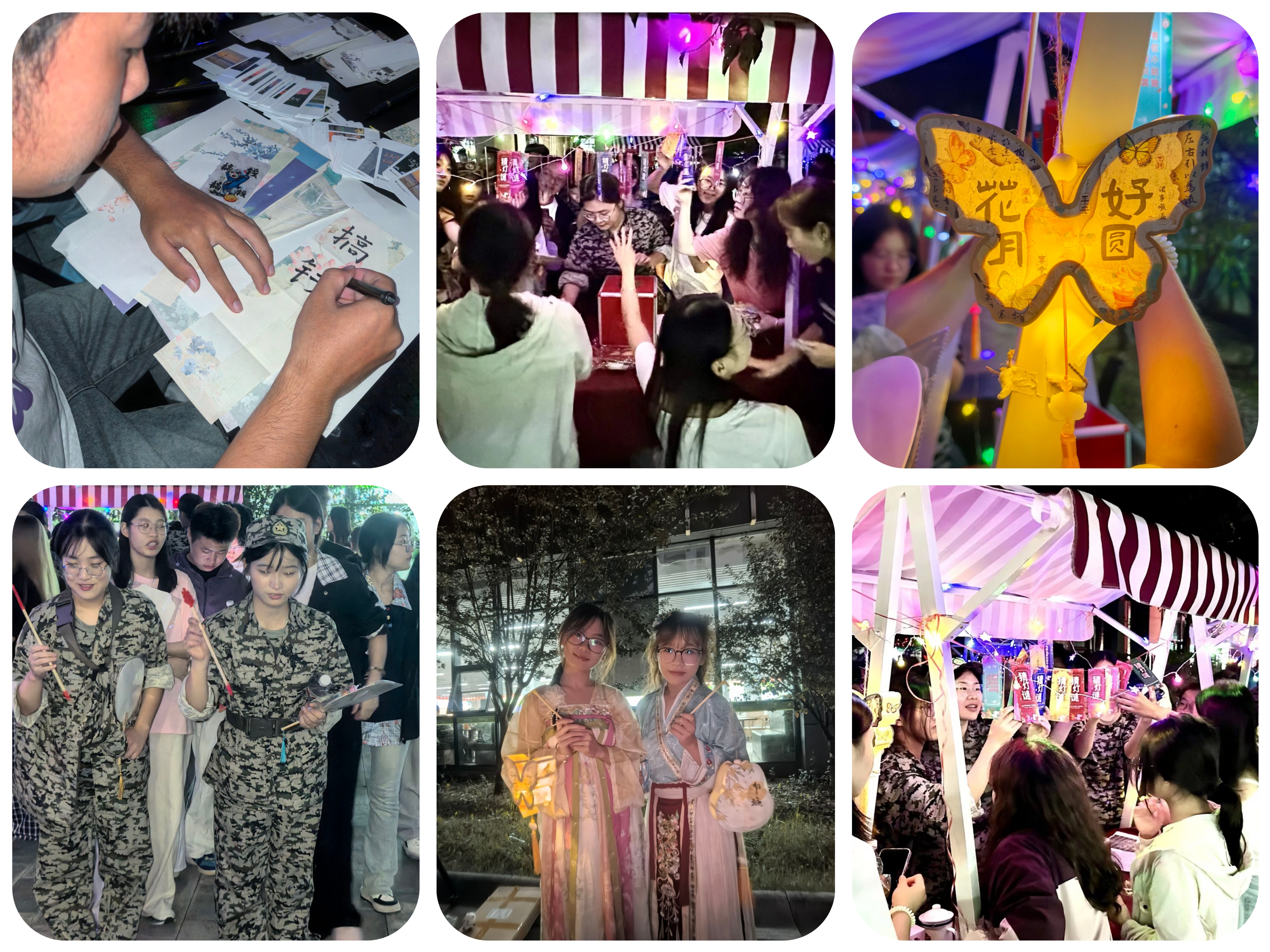猜灯谜环节注重文化性与专业性结合,工作人员精心筛选 200 余条灯谜,内容涵盖中华诗词、历史典故及国际贸易、旅游管理等专业知识,既考验同学文化积累,又强化专业认知;汉服展示环节以 “弘扬传统服饰文化” 为主题,精选襦裙、曲裾、明制汉服等代表性服饰,由公司礼仪队志愿者进行展示;DIY 绘画团扇、后羿射日投壶、飞花令等环节同样亮点突出,DIY 绘画团扇环节提供空白团扇、环保颜料等材料,鼓励同学发挥创意,创作中秋主题作品;后羿射日投壶环节还原传统娱乐形式,引导同学体验古人节日乐趣;飞花令环节以 “月”“秋” 为核心关键词,组织同学开展诗词接龙,展现深厚文化底蕴;随舞挑战环节则将传统节日氛围与青春活力相结合,同学自发参与舞蹈表演,展现积极向上的精神风貌,进一步增强活动互动性与感染力。