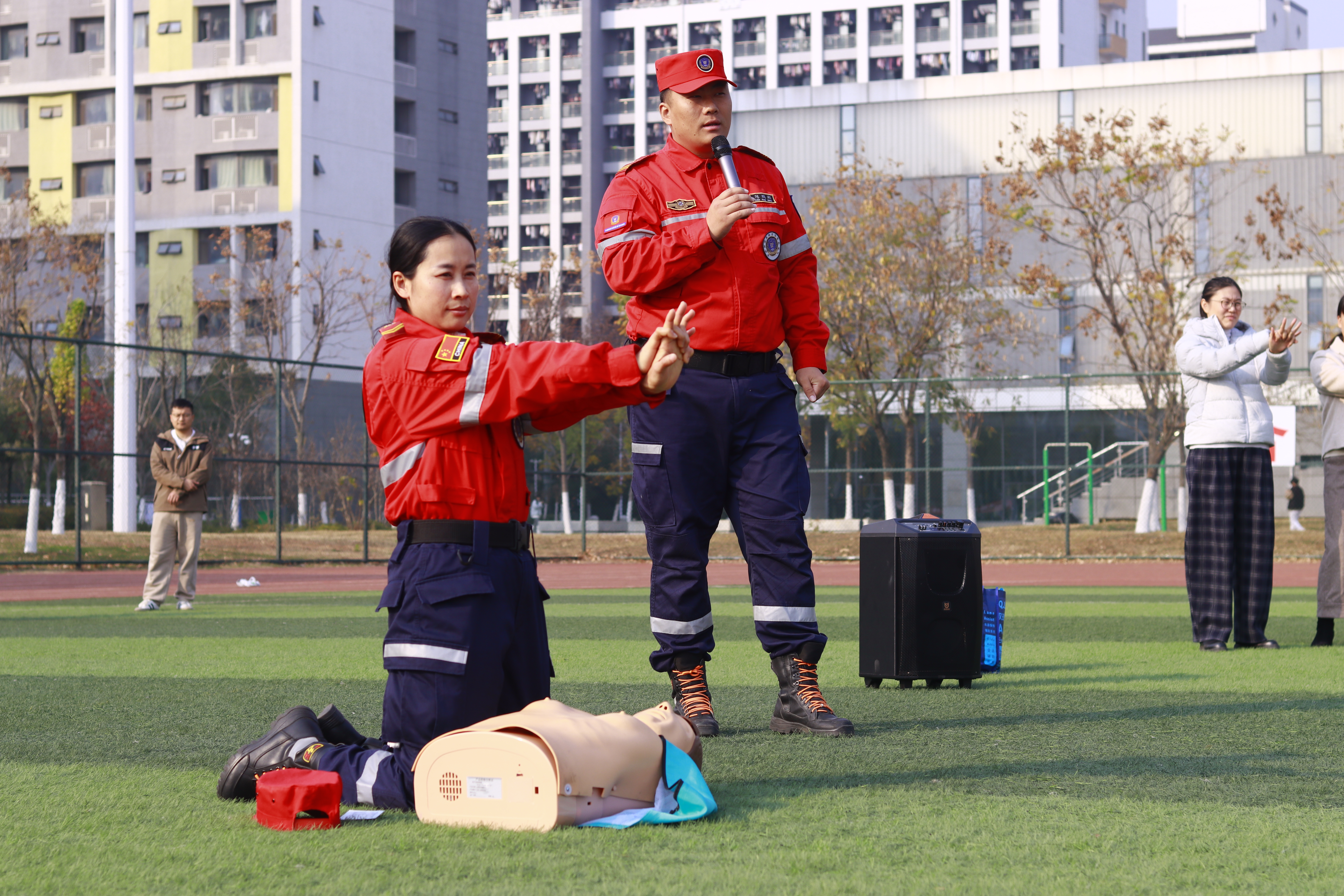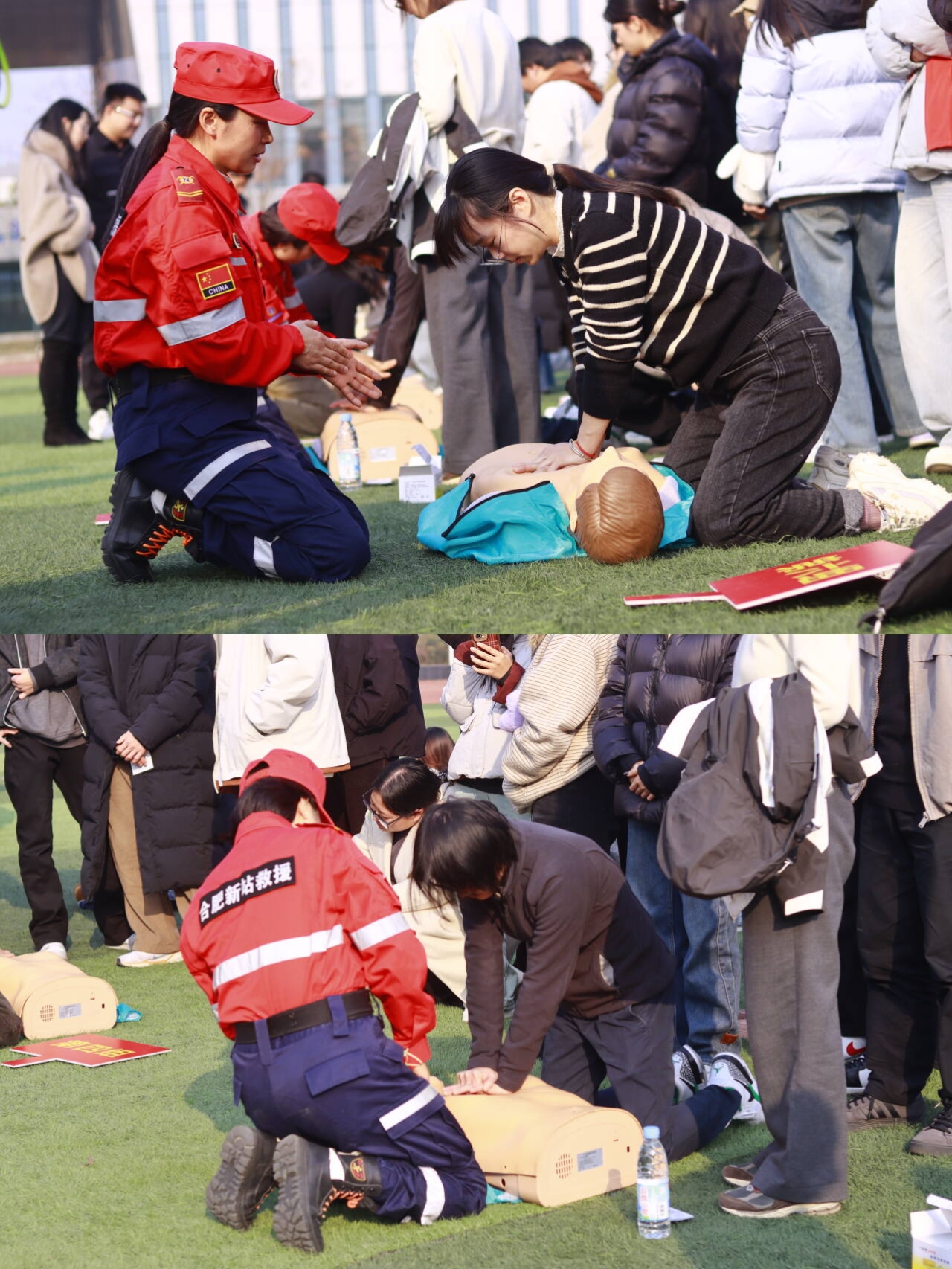 为增强师生安全防范意识,提升应对突发事件的自救互救能力,2025年12月10日下午,伟德体育官方网站联合新站高新区团工委、新站高新区应急和城市管理局,在汇心湖校区田径运动场举办了“师生应急救护培训实操演练暨消防安全知识科普活动”。本次活动由伟德体育官方网站与新站高新区应急救援队共同承办,公司全体在校班级辅导员、各班班长、生活委员及部分员工会干部参加。