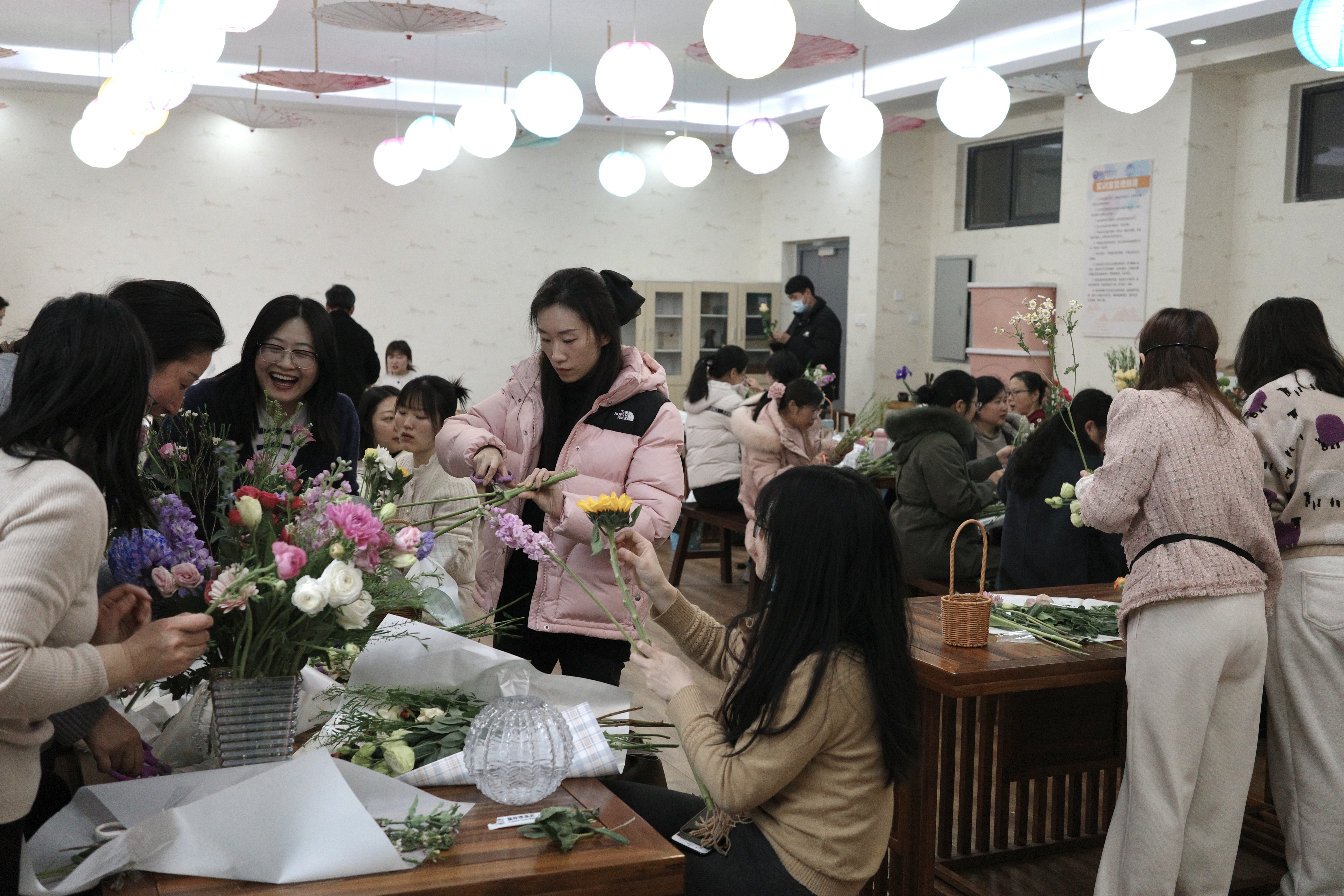 随后,专业花艺师详细介绍了插画的技巧和要点,并亲自示范了如何制作精美的花艺作品。女职工们聚精会神地聆听和观察,不时发出惊叹和掌声,现场气氛十分活跃。