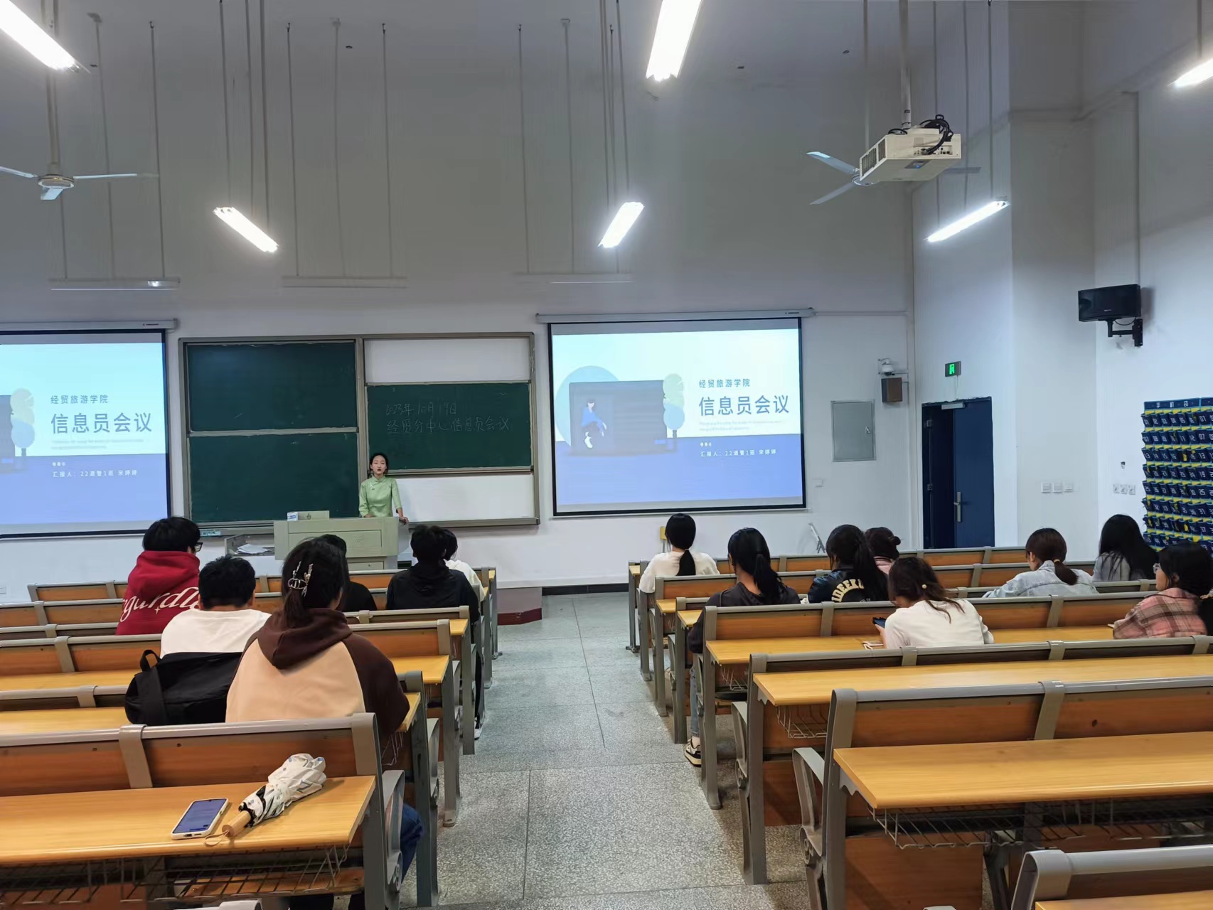 2.向23级各班信息员传达了信息员的职责以及评奖评优等情况。各班信息员在课程结束离开教室时,需要拍摄教室的照片发在信息员群中,平常负责检查教室教学设施,汇报老师上课是否存在迟到早退情况,在合职通里进行教学质量评价。同时担任信息员工作的同学和班级其他班干一样享受综测加分,后期也可以参与评选“优秀信息员”的称号。