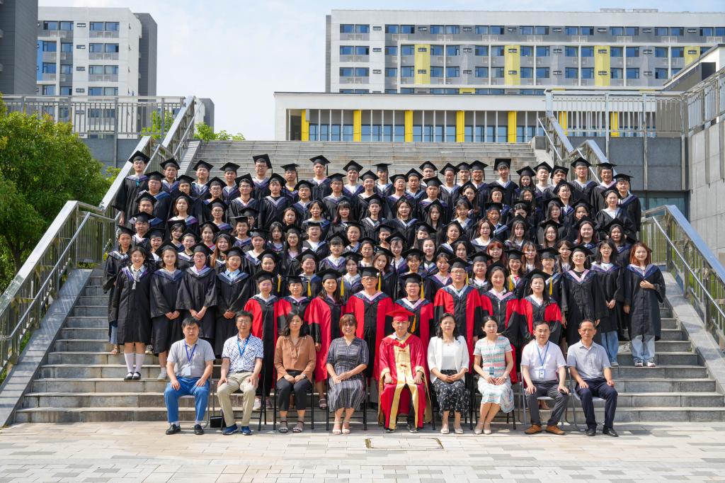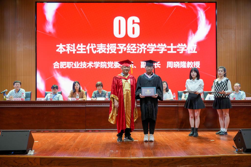 伟德体育官方网站副董事长周晓隆教授宣读2022届经济与金融专业毕业生学位授予决定,11位毕业生代表有序走上前台,周董事长与他们握手,为他们拨正流苏,颁发毕业证书、学士学位证书。