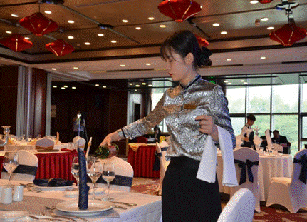 实习企业对公司实习生的综合表现十分满意,实习生的综合素质亦得到全面提升。员工们已然形成了在做中学、学中思、思中进的良好工作态势,能够将在校期间学习的理论知识熟练运用到实际工作中,积极克服困难,较好地完成企业方交付的工作任务,让顶岗实习的公司与社会衔接作用得到了很好的发挥。在安徽饭店2020年度岗位技能大赛中,“冠名班”7名同学分别获得了中、西餐摆台和中、西餐主题设计四项比赛的前三名,其中张子平同学更获得了西餐主题设计比赛项目第一名的好成绩。